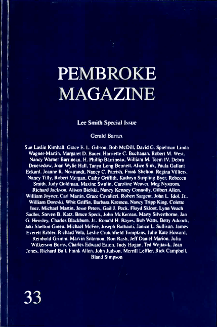 Pembroke Magazine, No. 33 (2001) contains a special feature on Lee Smith. The critic Sue Laslie Kimball suggested to Editor Shelby Stephenson that the magazine present such a project, using as a starting point papers from a Southern Literary Symposium at Methodist College on Lee Smith's fiction. Kimball and Stepehenson also invited writers and scholars to participate in this special issue, including Robert Morgan, Nancy Tilly, Robert West, Nancy Parrish, Bland Simpson, Grace Gibson, William Teem, Nancy Barrineau, Richard Vela, Jesse Peters, and many more.